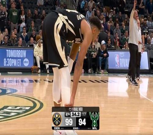 保护了自己全场,结果最后时候受伤,字母哥非常沮丧,默默就走回了更衣室。结果往更衣室走的时候,突然听到场上在欢呼,他又走回替补席坐在板凳席上看球。但是可以看到字母哥非常难受,捂着自己的脸很痛苦。